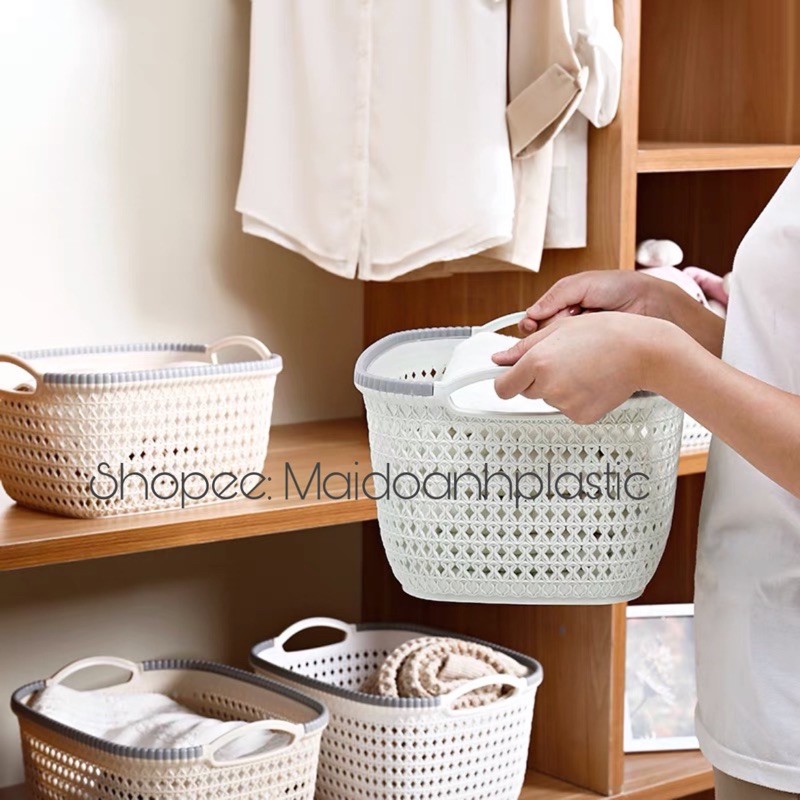 Rổ Nhựa Giả Đan Mây Có Quai Cầm được thiết kế giả đan mây , lỗ nhỏ, giúp bạn để được những vật nhỏ mà không bị rơt rớt