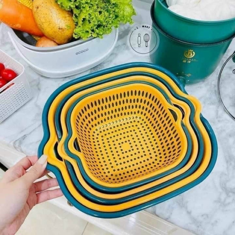 Kết hợp 2 loại rổ thành một đôi, một chiếc có công dụng để ráo, 1 chiếc để đựng nước, mang lại hiệu quả mỗi khi ngâm, rửa