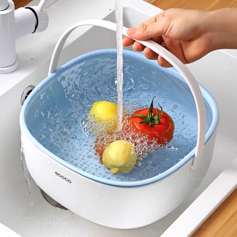 Rổ kèm chậu 2 lớp Ecoco được thiết kế có tay cầm, vừa có chậu rửa, vừa có rổ đáy lỗ thoáng khi thoát nước, rất tiện để đồ rửa rau, hoa quả, chén bát