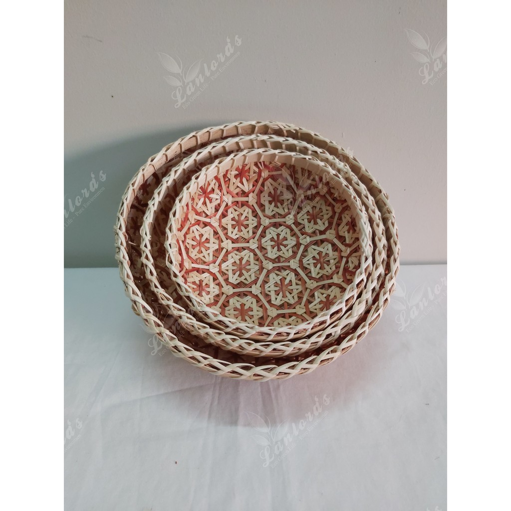 Bộ sản phẩm gồm 3 kích thước, size S đường kính 18cm, cao 8cm; size M đường kính 22cm, cao 9cm, size L đường kính 25cm, cao 10cm. Sản phẩm được làm thủ công tinh xảo từ các làng nghề truyền thống.** Bảo quản sản phẩm: tránh ẩm ướt quá lâu, luôn để khô ráo, lau sản phẩm bằng khăn ẩm, sau đó phơi nắng thật khô