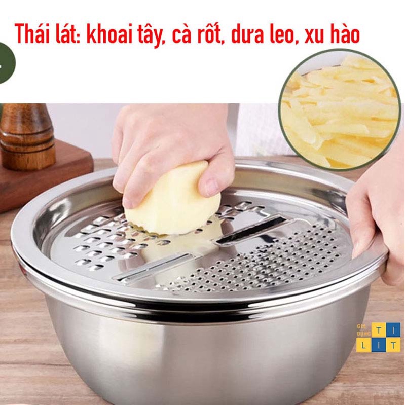🍀🍀CHI TIẾT: Bộ gồm 1 chậu inox 100% cao cấp, dày dặn, 1 rổ inox, 1 mâm để nạo, gọt nhiều kiểu