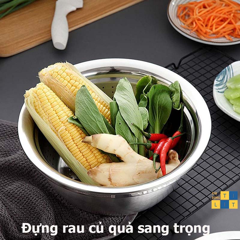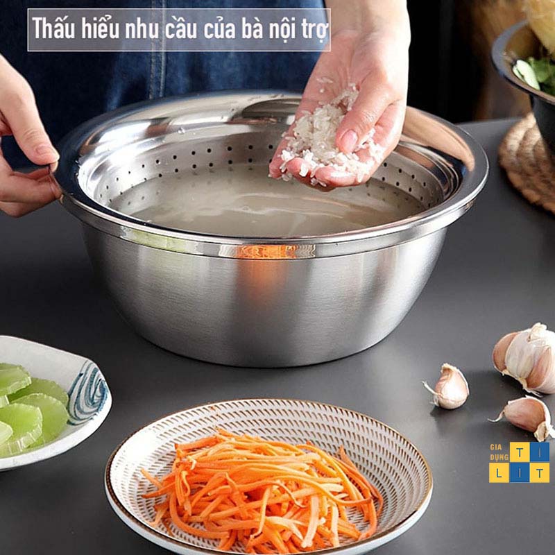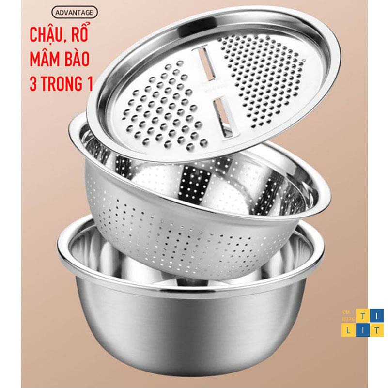 BỘ RỔ VÀ CHẬU INOX KÈM MÂN NẠO VÀ GỌT VỎ RAU, CỦ, QUẢ 3 CHI TIẾT - ĐA NĂNG - TIỆN DỤNG - TIẾT KIỆM DIỆN TÍCH BẾPThấu hiểu nhu cầu của bà nội trợ trong "sứ mệnh" vô cùng thiêng liêng trong mỗi bữa ăn, chúng tôi đã nhập khẩu về bộ rổ inox đa năng, 3 chi tiết, vừa làm RỔ, vừa làm CHẬU, vừa làm MÂM NẠO, GỌT, THÁI LÁT rau, củ, quả chuyên nghiệp đa năng, làm cho món ăn vô cùng đẹp mắt đồng thời tiết kiệm diện tích bếp.
