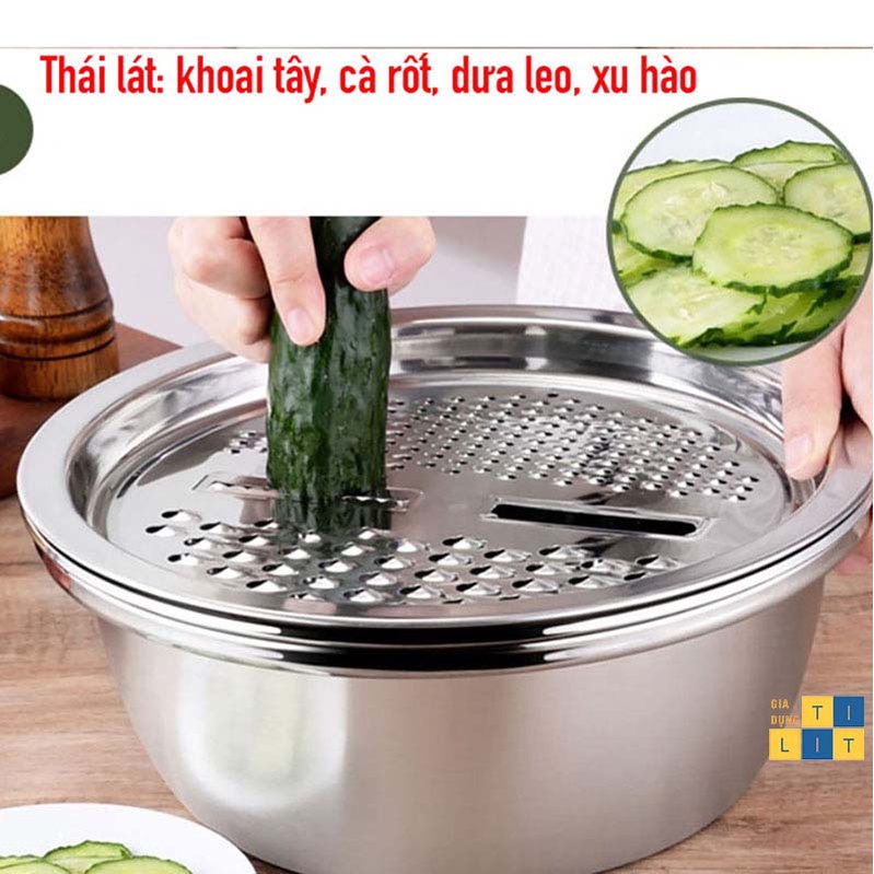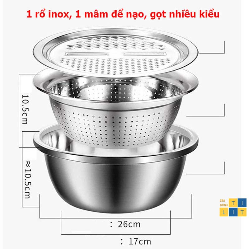 Nhà cửa & Đời sống > Dụng cụ nhà bếp > Bàn nạo, dụng cụ bào, cắt || Bộ rổ và chậu inox kèm mâm nạo và gọt vỏ rau, củ, quả 3 trong 1 đa năng, tiện dụng, tiết kiệm [RỔ 3]Còn hàng