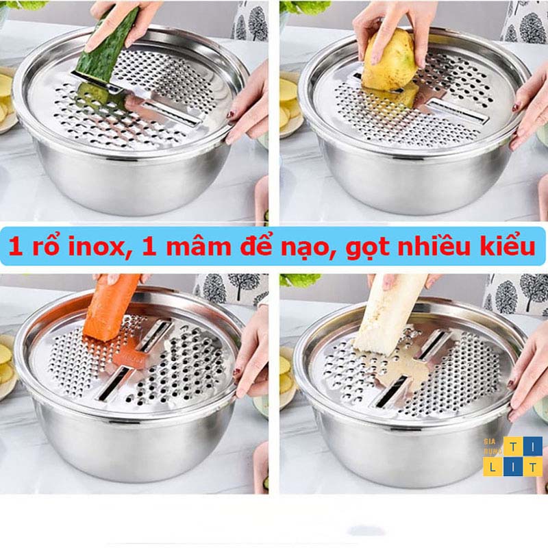 Bộ rổ và chậu inox kèm mâm nạo và gọt vỏ rau, củ, quả 3 trong 1 đa năng, tiện dụng, tiết kiệm [RỔ 3]