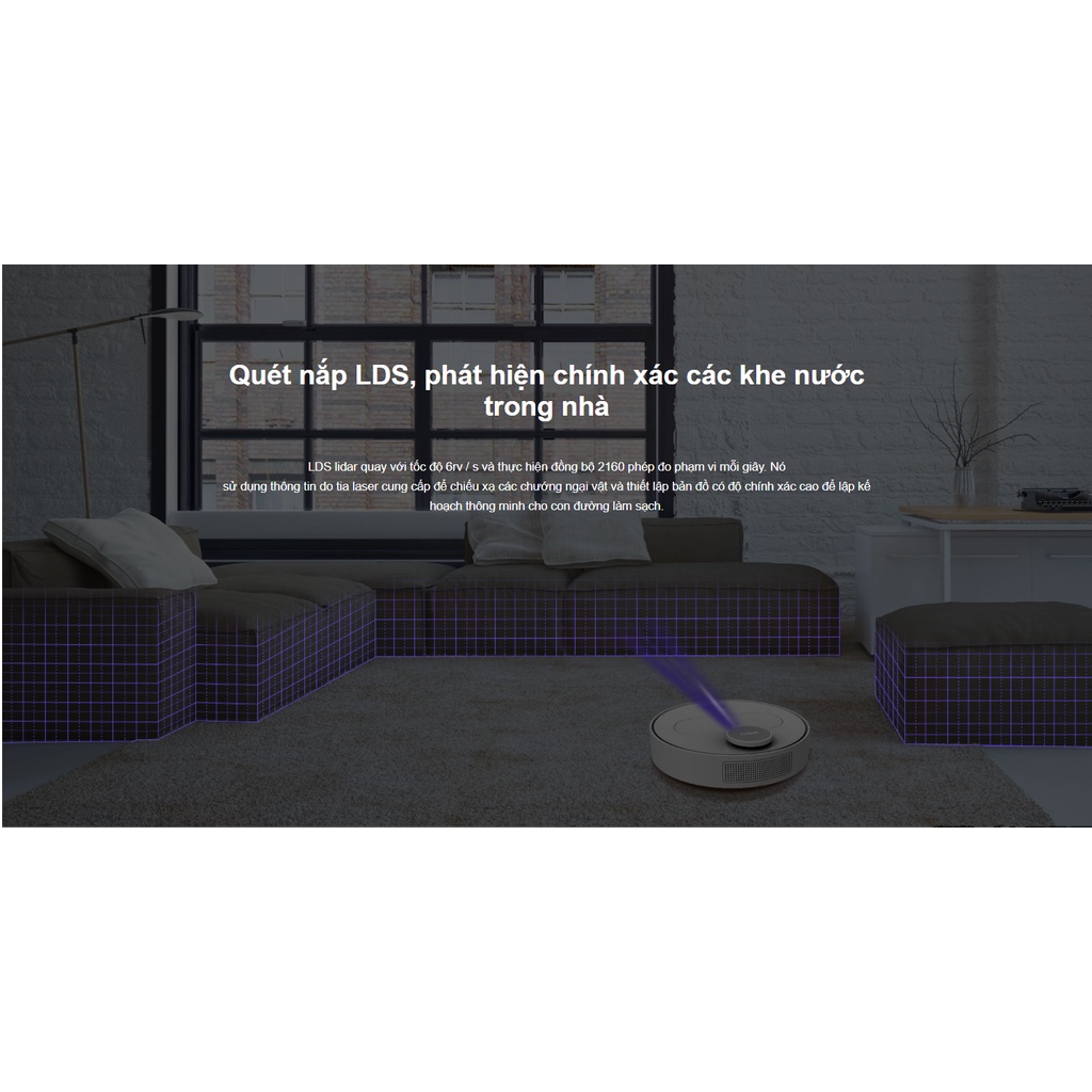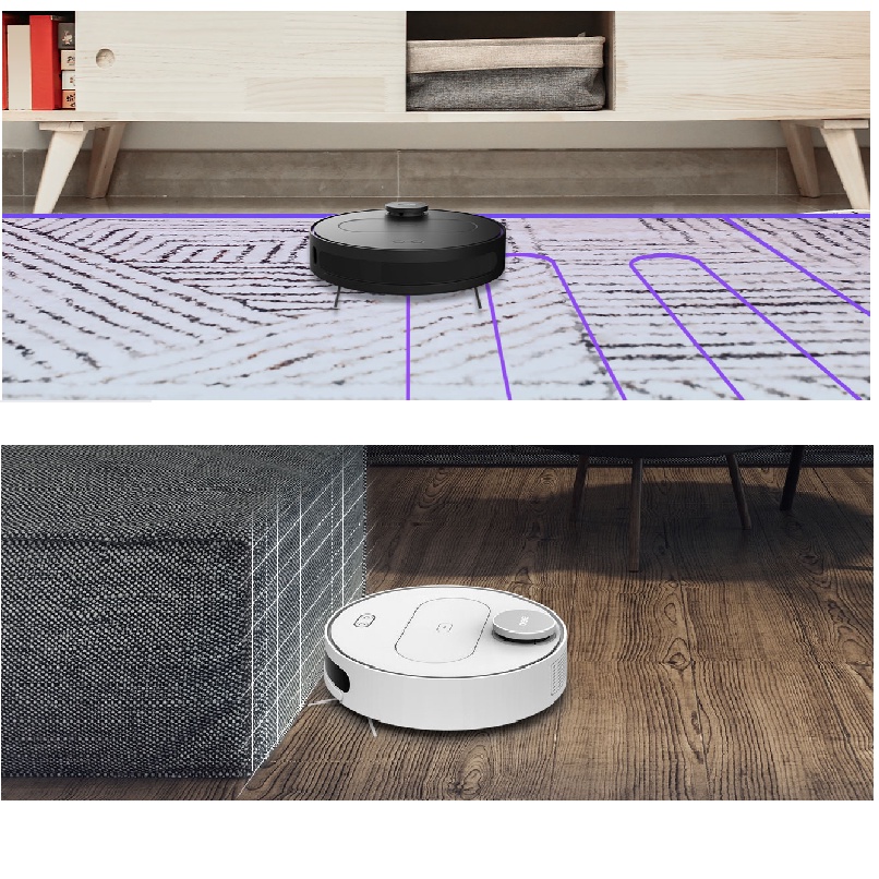 - LDS lidar quét, thuật toán Slam để vẽ bản đồ chính xác. Tránh chướng ngại vật cộng tác đa cảm biến. Tích hợp cảm biến chống rơi. Tự động sạc lại + tiếp tục làm sạch.