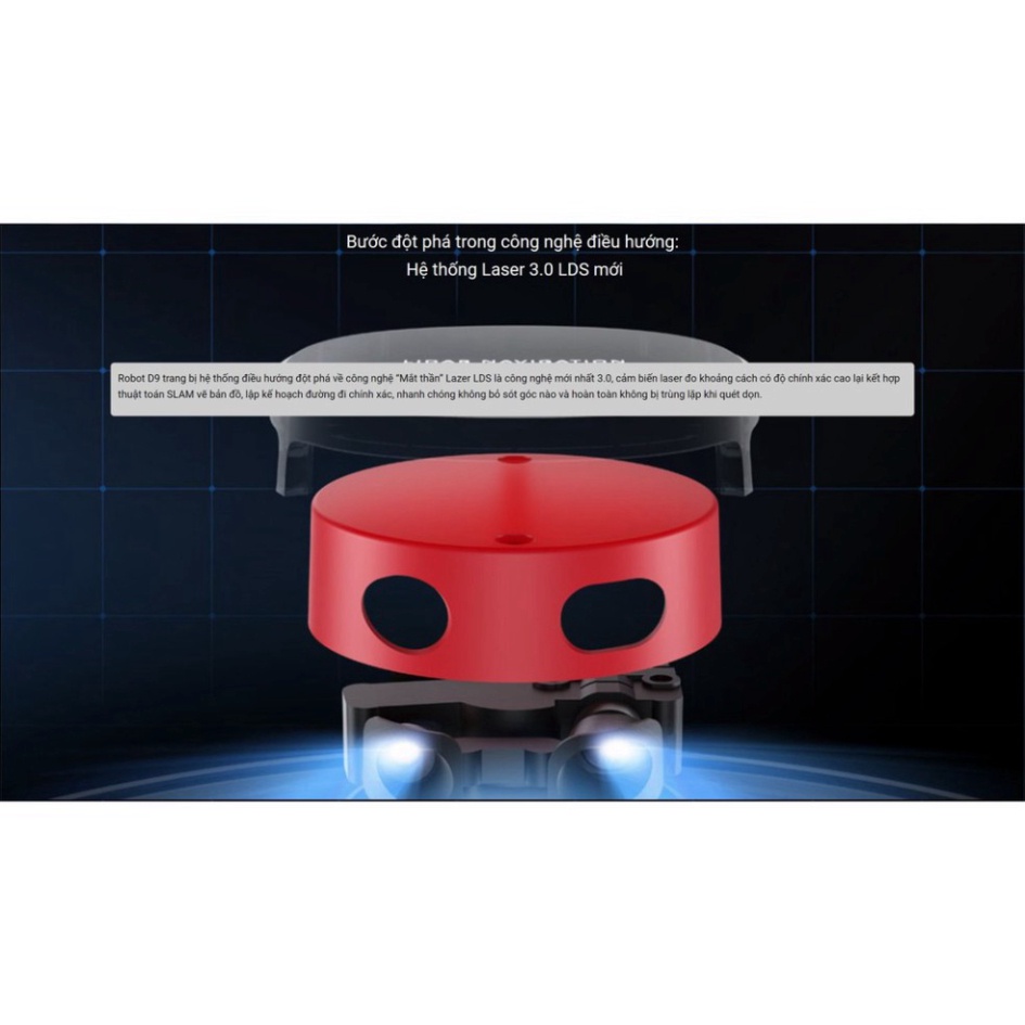 Nhà sản xuất công bố, Dreame D9 sử dụng công nghệ Lidar thế hệ 3.0 kết hợp với thuật toán SLAM để vẽ bản đồ chính xác, lập kế hoạch đường đi nhanh chóng, không bỏ sót, không trùng lặp.