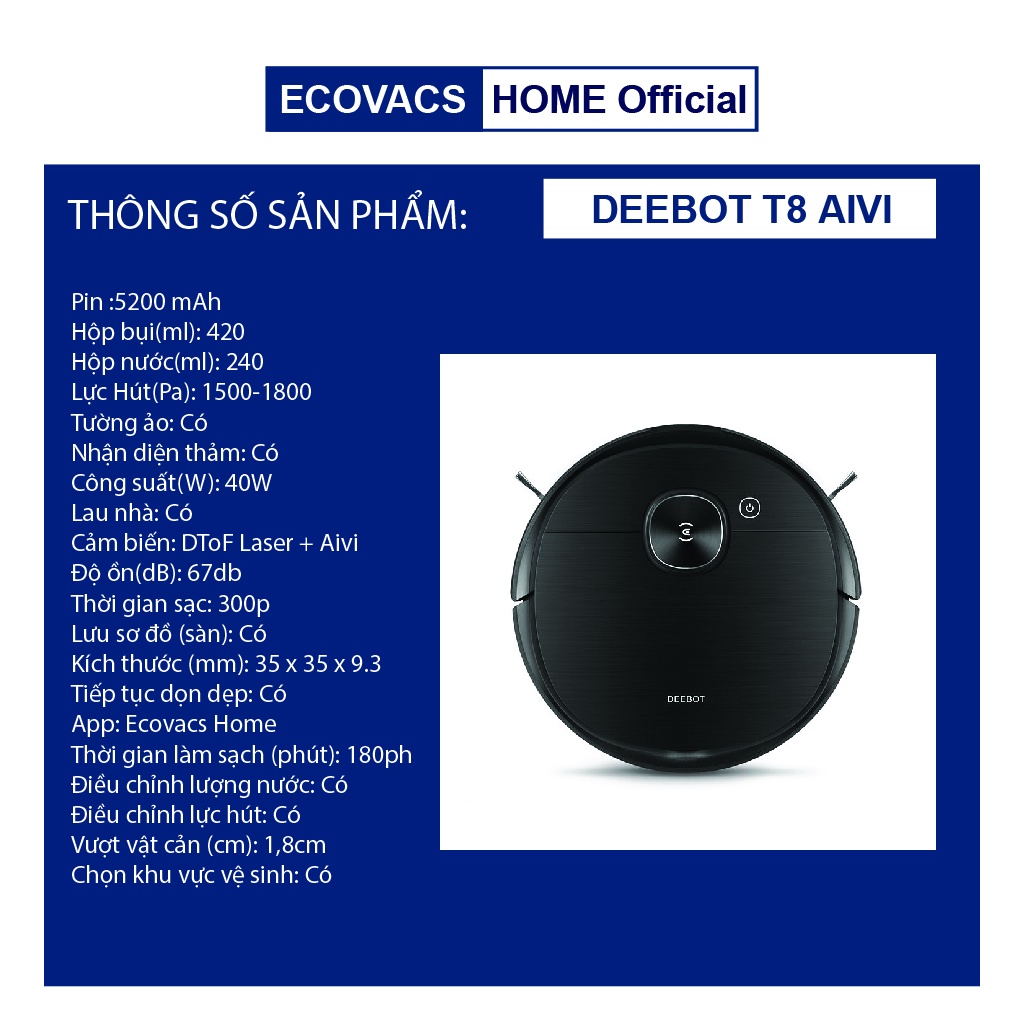 Thiết Bị Điện Gia Dụng > Thiết bị điện gia dụng nhỏ > Máy hút bụi & Thiết bị làm sạch sàn || ✅ Robot hút bụi lau nhà Ecovacs Deebot T8 AIVI PRO 2021chính hãngCòn hàng