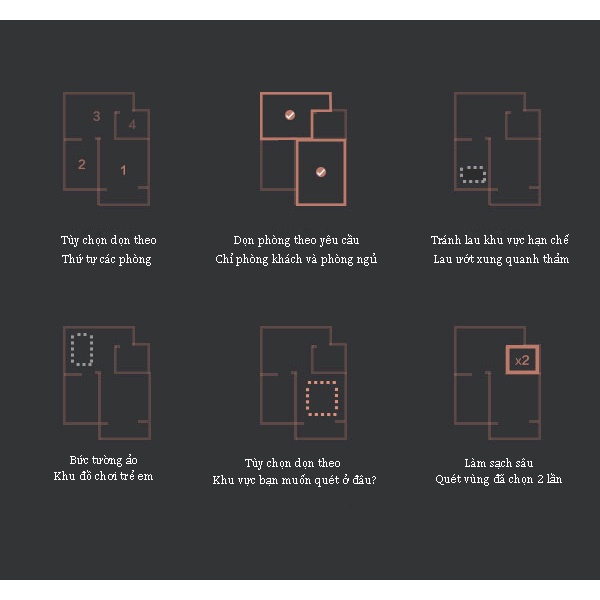 💥 Chế độ làm sạch: toàn bộ, từng phòng, khu vực