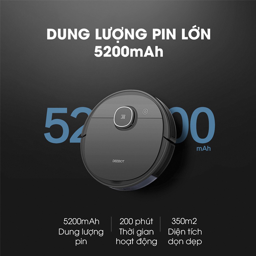 Robot hút bụi lau nhà Ecovacs Deebot T5 Hero được trang bị viên pin lớn nhất trong tất cả các mẫu robot hút bụi lau nhà 5200mAh giúp robot có thể hoạt động liên tục đến 200 phút và làm sạch lên đến 300m2 mặt sàn.