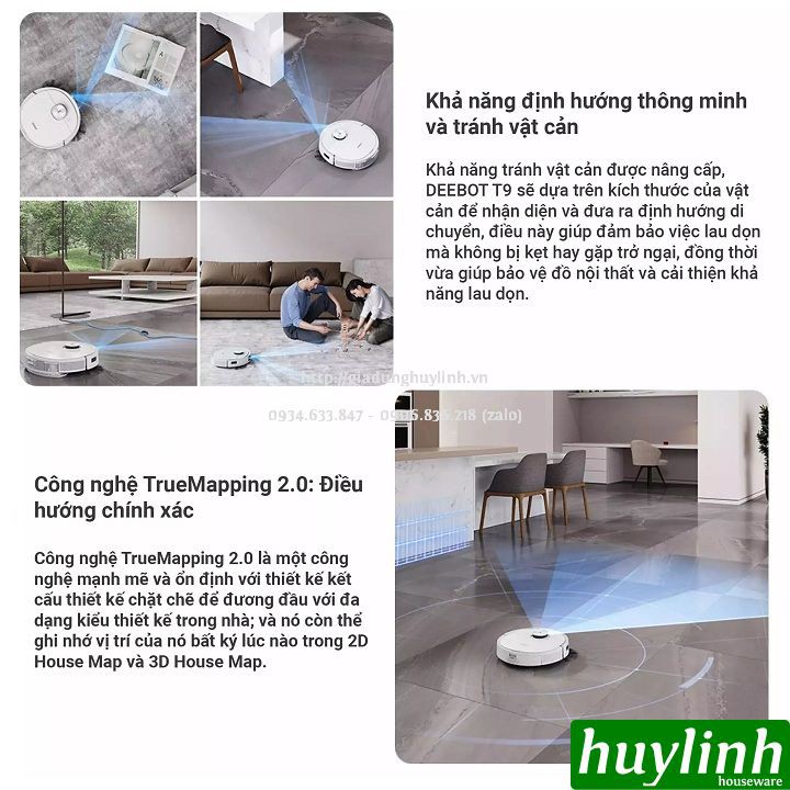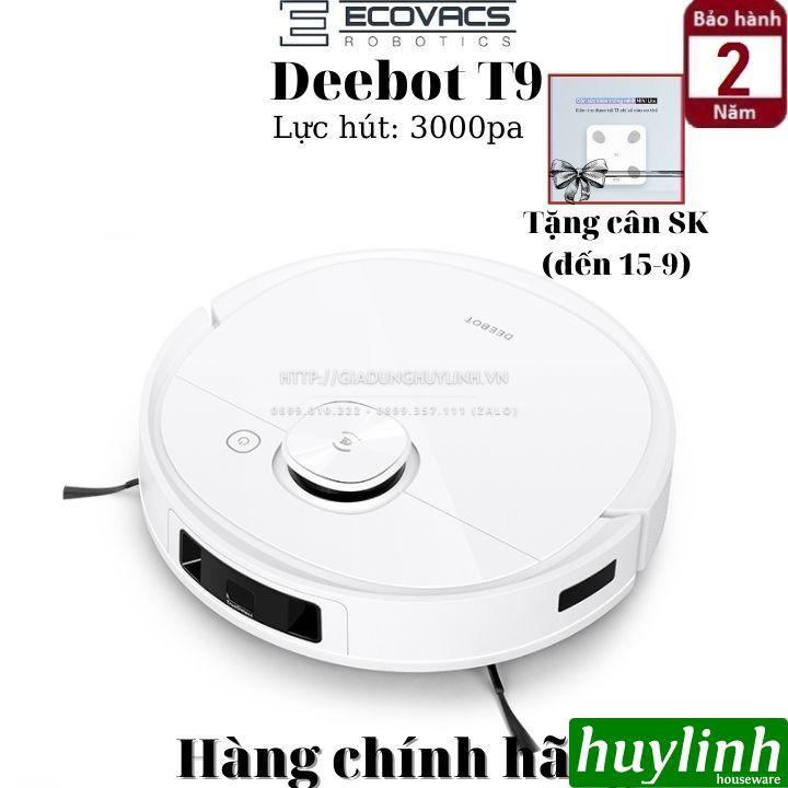 Robot hút bụi lau nhà Ecovacs Deebot T9 là dòng robot hút bụi cao cấp, được phân phối chính hãng tại Việt Nam, với lực hút lên tới 3000pa, công nghệ TrueDetect 3D 2.0 vượt trội cùng công nghệ thiết lập bản đồ thông minh True Mapping 2.0, dựng bản đồ 3.0 hệ thống lau Ozmo rung siêu sạch.Huy Linh phân phối và bảo hành chính hãng tại Ecovacs Việt Nam