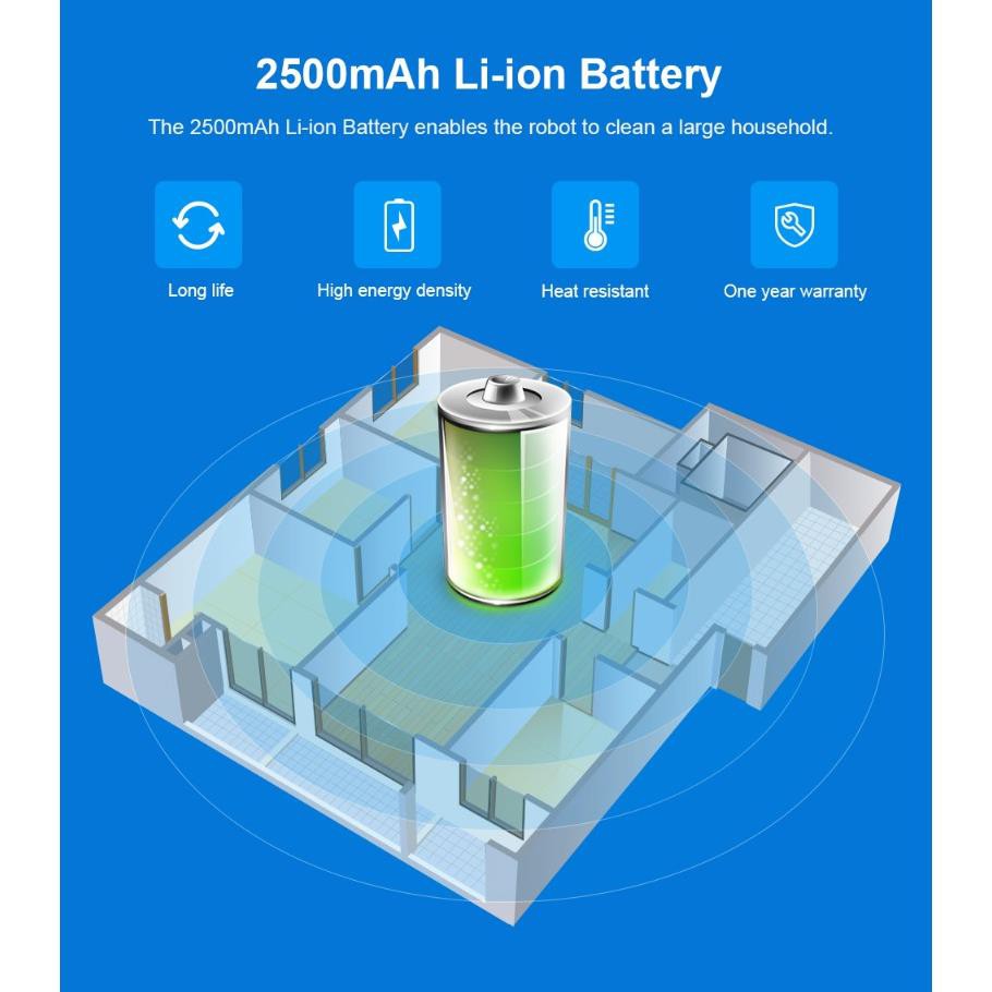 🏎Dung lượng pin Li-ion 2500mAh cho thời gian hoạt động liên tục tới 100 phút, diện tích làm sạch: 150m2. Robot Liectroux C30B sẽ tự động trở về sạc nguồn khi hết pin, hoặc hoàn thành nhiệm vụ.