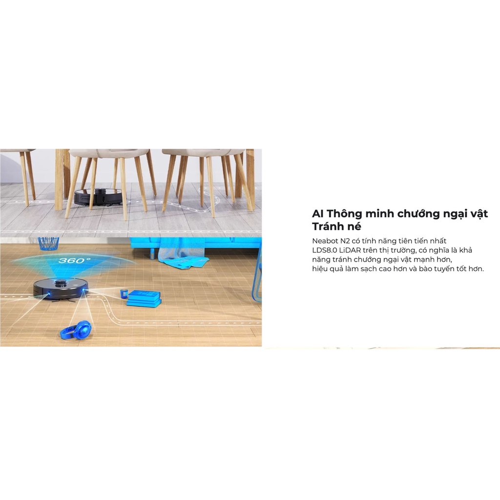- Tự động đánh giá chiều cao chướng ngại vật giúp cho máy không có khả năng bị mắc kẹt như các phiên bản robot thông thường. Đây là một trong công nghệ LDS 4.0 đi đầu được áp dụng trên NEABOT N2 LITE