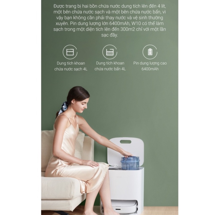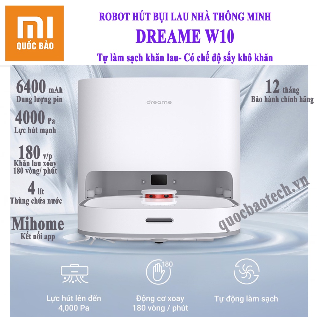 - Dreame W10 có thể nói là cuộc cách mạng phá vỡ sự nhận thức về robot hút bút lau nhà lâu nay, W10 không chỉ sửa đổi đáng kể cấu trúc thiết kế hình dáng bên ngoài, mà còn trang bị lực hút siêu lớn 4000Pa, tốc độ quét cực nhanh, khả năng thích ứng với môi trường xung quanh mạnh mẽ, đặc biệt là chức năng lau sàn nhà: khăn lay xoáy tròn xoáy sâu vết bẩn cứng đầu giúp sàn nhà trở nên sạch bong sáng bóng, thậm chí còn thêm tính năng sấy khô sau khi giặt giẻ và tự động giặt giẻ.