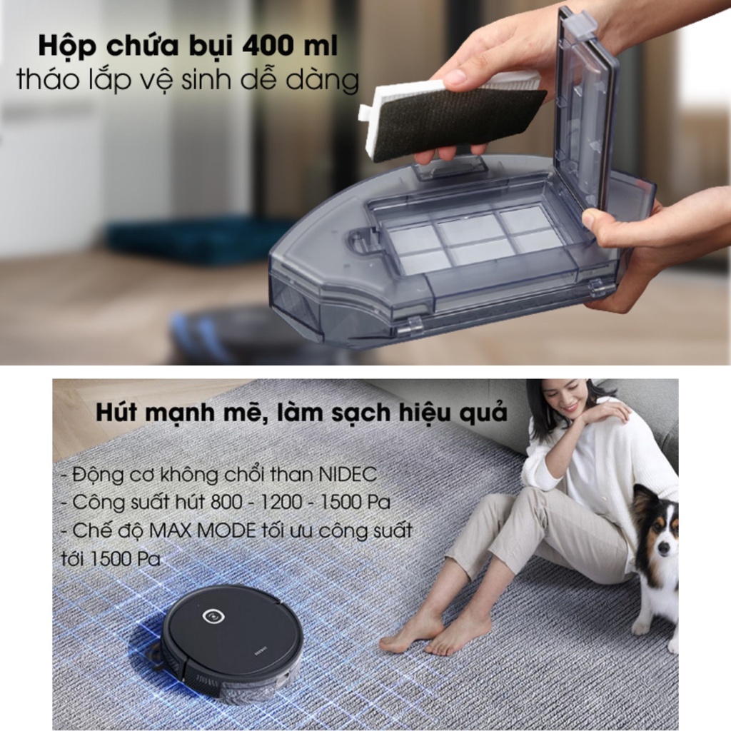 - chổi chống vướng, rối lông thú cưng với hộp chứa bụi full size lên đến 800 ml, dung lượng pin lên đến 3200 mAh, tự động quay về đế sạc, Robot làm sạch liên tục 150 phút bao phủ diện tích 250 m2, tự động quay về đế sạc khi gần cạn pin