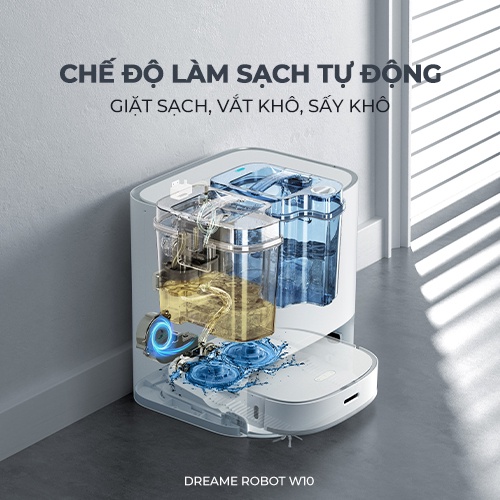 Dreame Bot W10 là một hệ thống hút bụi, lau sàn và làm sạch tự động với quy trình hoạt động hoàn toàn khép kín, giúp tối ưu hoá trải nghiệm sử dụng của gia chủ.Dreame Bot W10 được thiết kế đặc biệt với tấm lau sàn xoay và lực hút tối đa lên đến 4,000 Pa, W10 có thể dọn sạch mọi loại bụi bẩn và vết bẩn cứng đầu trên sàn nhà một cách dễ dàng. Tấm lau được thiết kế để xoay 180 vòng mỗi phút, tạo áp lực 10N để làm sạch bất kì loại mặt sàn nào từ gỗ, kính đến gạch men… Nhờ vào thiết kế đặc biệt, W10 có thể tiếp cận sâu nhất đến các góc phòng, nơi mà nhiều máy hút bụi không thể chạm tới để làm vệ sinh. Chổi phụ lấy mảnh vụn ra khỏi khe tường, trong khi, đầu chổi lăn kích thước lên đến 19.2 cm sẽ hút sạch các bụi bẩn đó một cách hiệu quả và nhanh chóng.