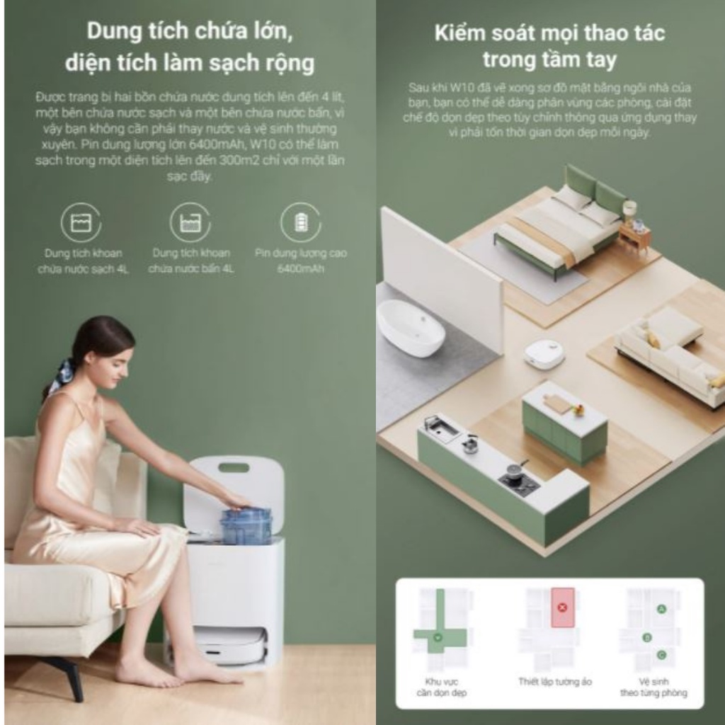 - Dung lượng pin lớn 6400mAh cho thời gian làm sạch lâu hơn