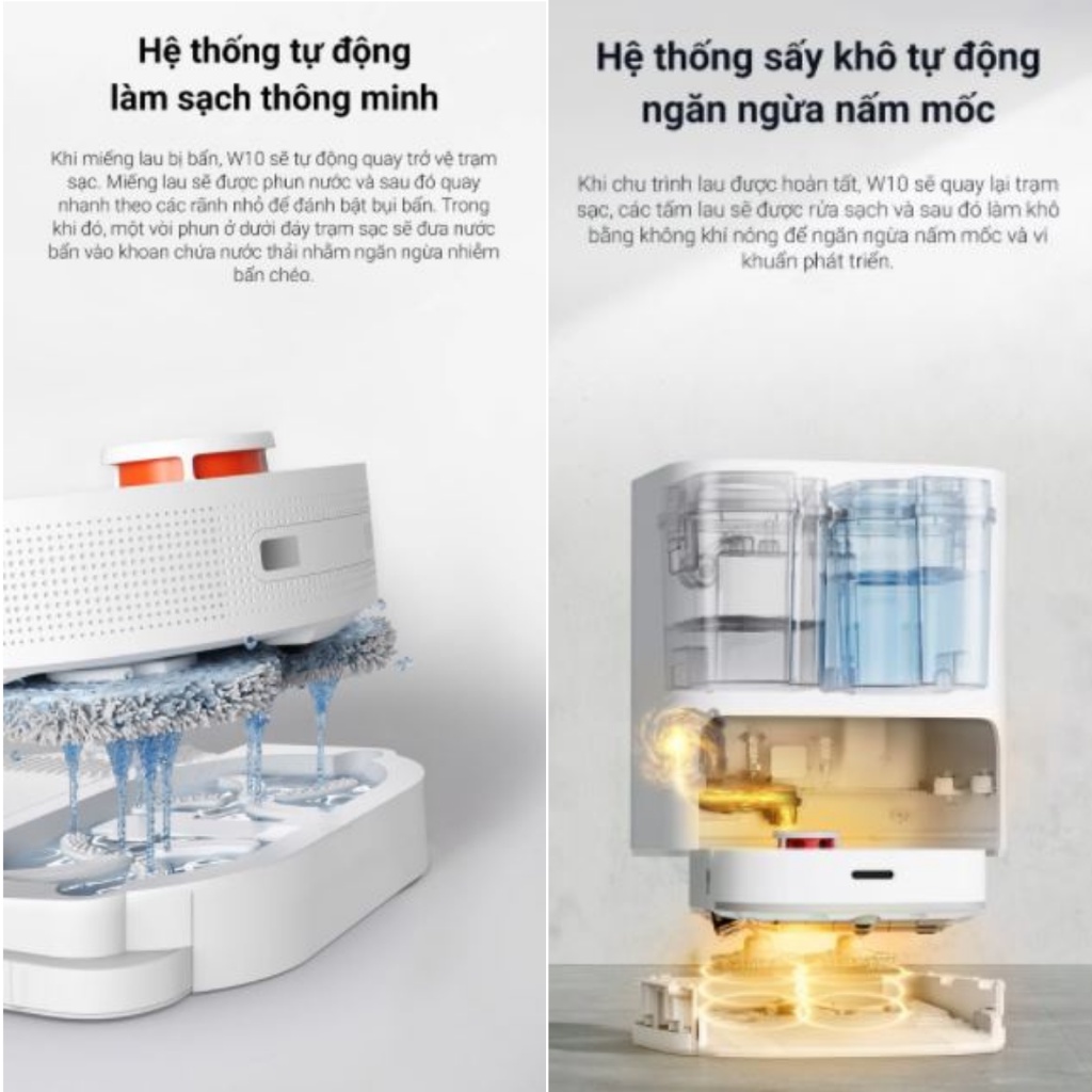 Robot hút bụi lau nhà Dreame Bot W10 sử dụng bể chứa nước sạch 4L (Màu xanh) và bể chứa nước thải 4L (Màu xám) độc lập, khi robot quay về dock sạc sau làm việc xong hoặc tiếp thêm năng lượng thì lúc này thiết bị sẽ tự làm sạch khăn lau và sấy khô bằng gió nóng.