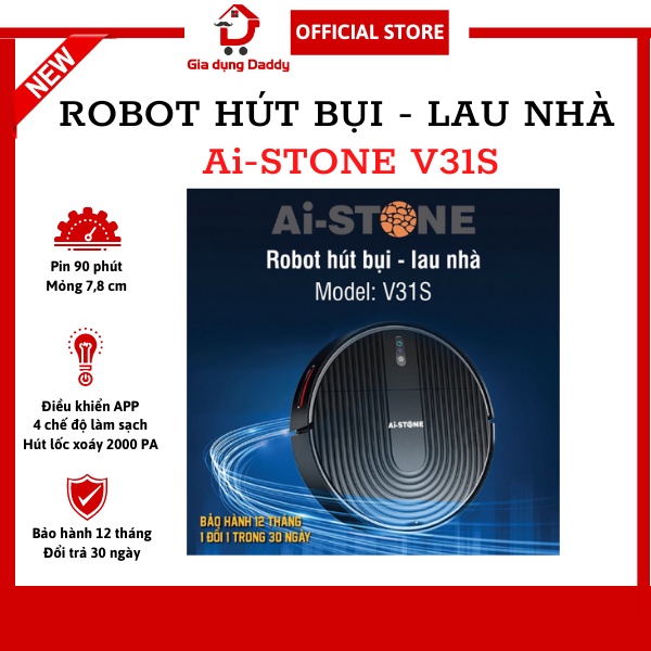 Robot hút bụi lau nhà tự sạc thông minh Ai-STONE V31S, Điều khiển App, 4 chế độ làm sạch Cảm biến chống rơi BH 12 tháng