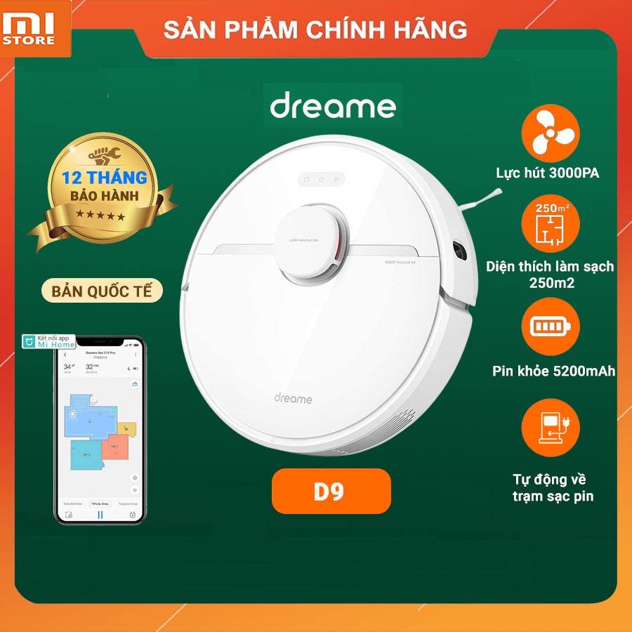- Với 15 cải tiến vượt trội so với các dòng robot khác. Robot Hút Bụi Lau Nhà Dreame D9 hẳn là một sản phẩm đáng để lựa chọn với động cơ Nidec Nhật bản, cùng khả năng lưu bản đồ 3 tầng.Lực hút 3000Pa, hút sạch 99,9% các vết bẩn.