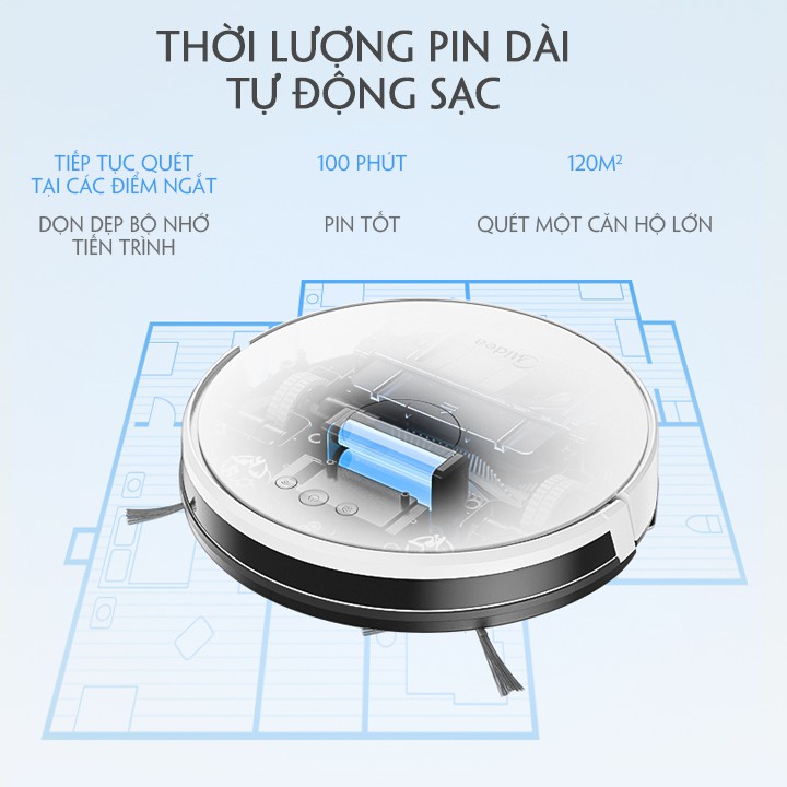 - Thời lượng làm việ 100 phút tương đương với 120m2, nhờ sử dụng pin dung lượng cao