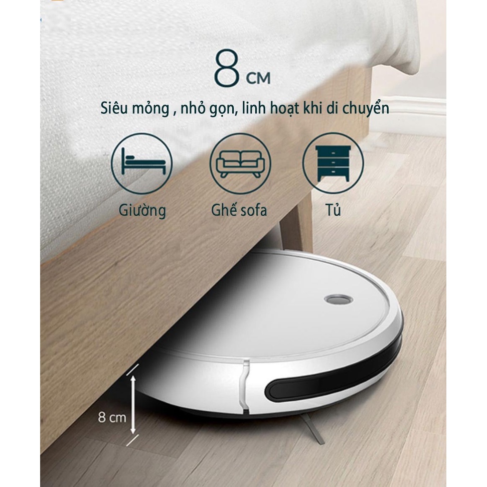 Robot hút bụi 3 trong 1 với thiết kế siêu mỏng, có thể dễ dàng làm sạch bên dưới các đồ nội thất như giường, ghế sofa và bàn cà phê. Khả năng đặt lịch làm sạch cho robot hút bụi để lau nhà khi bạn đang làm việc. Yên lặng để không làm phiền trong khi làm sạch và tự động quay trở lại trạm sạc sau khi làm sạch.