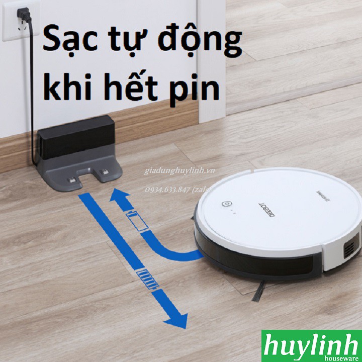 - Khi pin yếu, bạn không cần phải lấy robot đi sạc, Deebot sẽ tự động trở về trạm Dock của mình đã được cắm điện sẵn và tự động sạc.