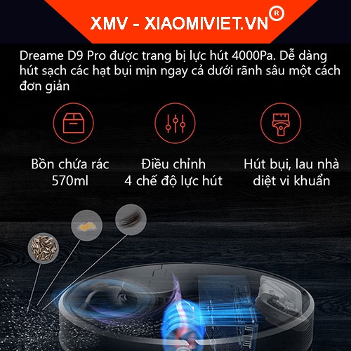 Giới thiệu Robot hút bụi Xiaomi Dreame D9 Pro - Lực hút 4000PA - Pin 5200mAh - Lưu 3 bản đồ - Hàng chính hãng - Bảo hành 12 tháng