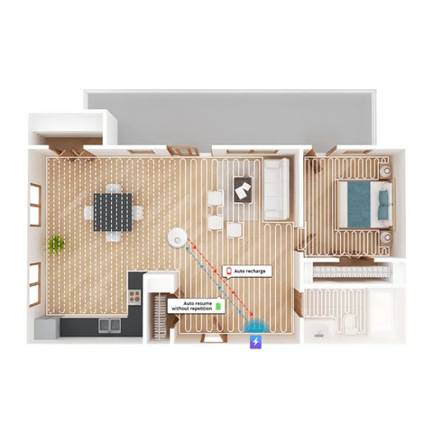 - Công nghệ Lidar SLAM vẽ sơ đồ sàn nhà và dùng thuật toán Slam để tính toán quãng đường đi ngắn và hiệu quả nhất để hút bụi(Màn hình điện thoại sẽ hiện lên những vị trí nào đã đi qua, chỗ nào chưa đi qua, số m2 đã hút được, xác định được vị trí sạc pin nên khi quay về dock sạc sẽ rất nhanh gọn)- Trên màn hình điện thoại có thể tạo tường ảo ở những vị trí trong ngôi nhà không muốn robot đi vào. Và cũng có thể khoanh vùng làm việc.