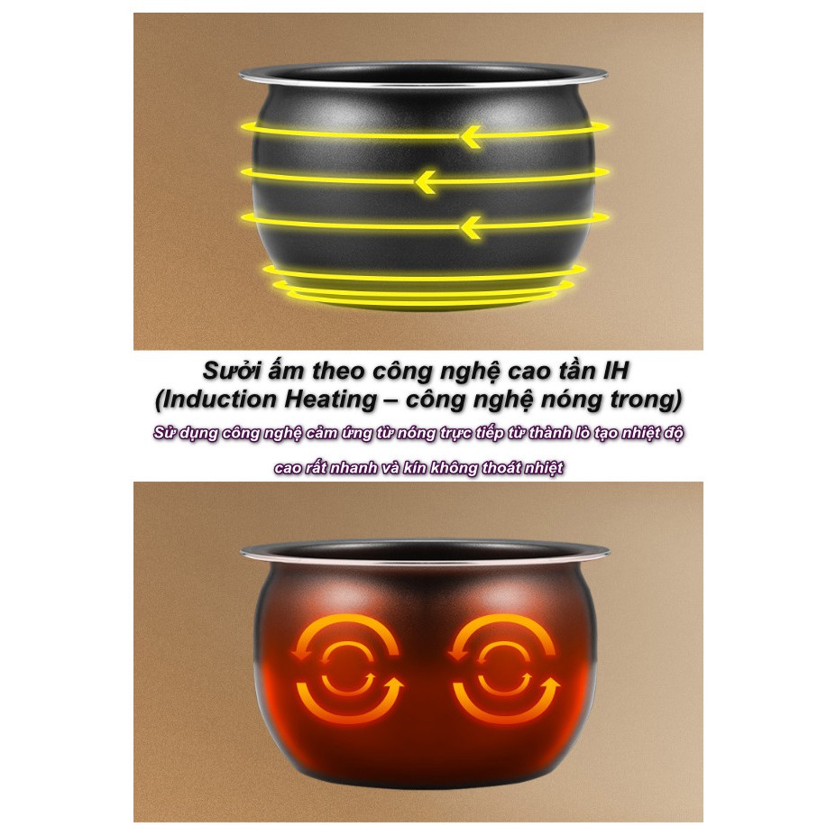 - Nồi làm nóng theo công nghệ điện cao tần IH (viết tắt từ Induction Heating – công nghệ đốt nóng trong) sử dụng công nghệ cảm ứng từ làm nóng trực tiếp từ thành nồi tạo luồng nhiệt cao nóng rất nhanh và kín không thoát nhiệt, phân bổ đều 360 độ, giúp làm thức ăn chín nhanh và đều, nấu cơm ngon (như nấu trong nồi gang) và bảo toàn dưỡng chất trong thức ăn, đồng thời không thoát nhiệt, giảm thiểu khói, không gây mùi hoặc nóng không gian xung quanh trong bếp.