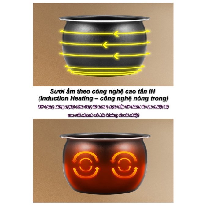 - Nồi làm nóng theo công nghệ điện cao tần IH (viết tắt từ Induction Heating – công nghệ đốt nóng trong) sử dụng công nghệ cảm ứng từ làm nóng trực tiếp từ thành nồi tạo luồng nhiệt cao nóng rất nhanh và kín không thoát nhiệt, phân bổ đều 360 độ, giúp làm thức ăn chín nhanh và đều, nấu cơm ngon (như nấu trong nồi gang) và bảo toàn dưỡng chất trong thức ăn, đồng thời không thoát nhiệt, giảm thiểu khói, không gây mùi hoặc nóng không gian xung quanh trong bếp.