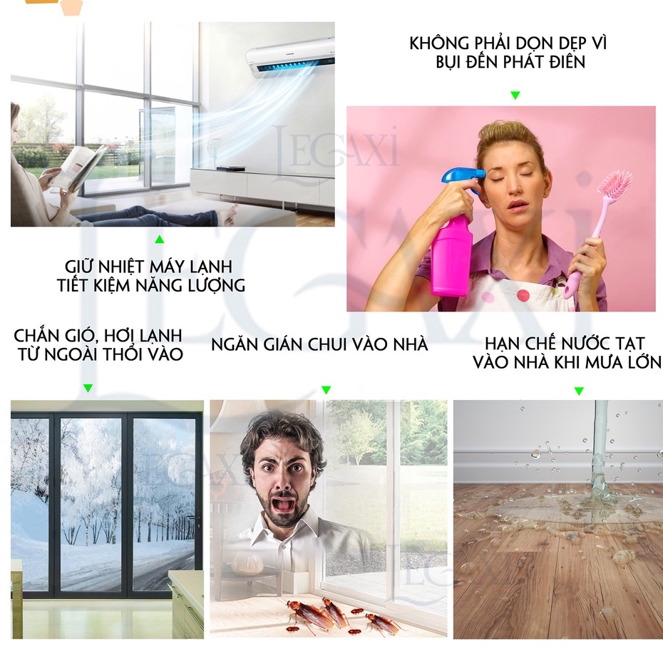 - Ngăn bụi thổi theo gió vào phòng, giúp phòng luôn sạch sẽ, sản phẩm có thể lắp ở các vị trí: khe hở cửa lớn, khe hở cửa sổ, khe cửa phòng WC
