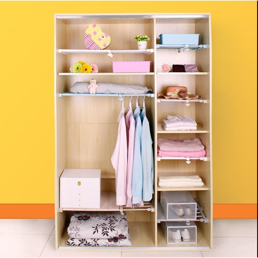 🔸Kệ chia ngăn đa năng không cần khoan không cần bắt vít, có thể điều chỉnh độ dài ngắn tùy ý, giúp bạn tạo thêm nhiều ngăn trong tủ quần áo, tủ bát, làm kệ chứa đồ, lắp đặt cực kì đơn giản tận dụng khoảng trống cực tốt.