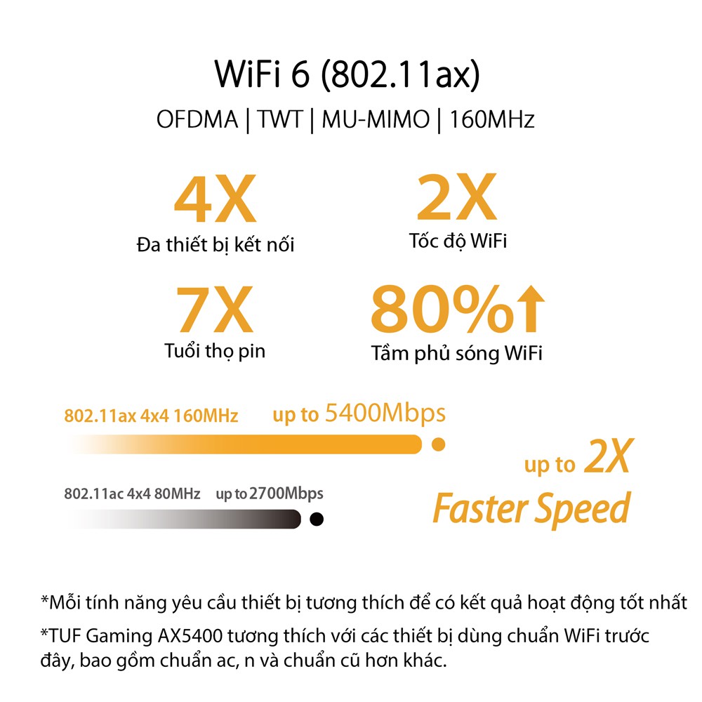 WiFi 6 siêu nhanh - Tận hưởng tốc độ lên đến 5400 Mbps và hiệu quả mạng gấp 4 lần với OFDMA và các kênh 160 MHz.