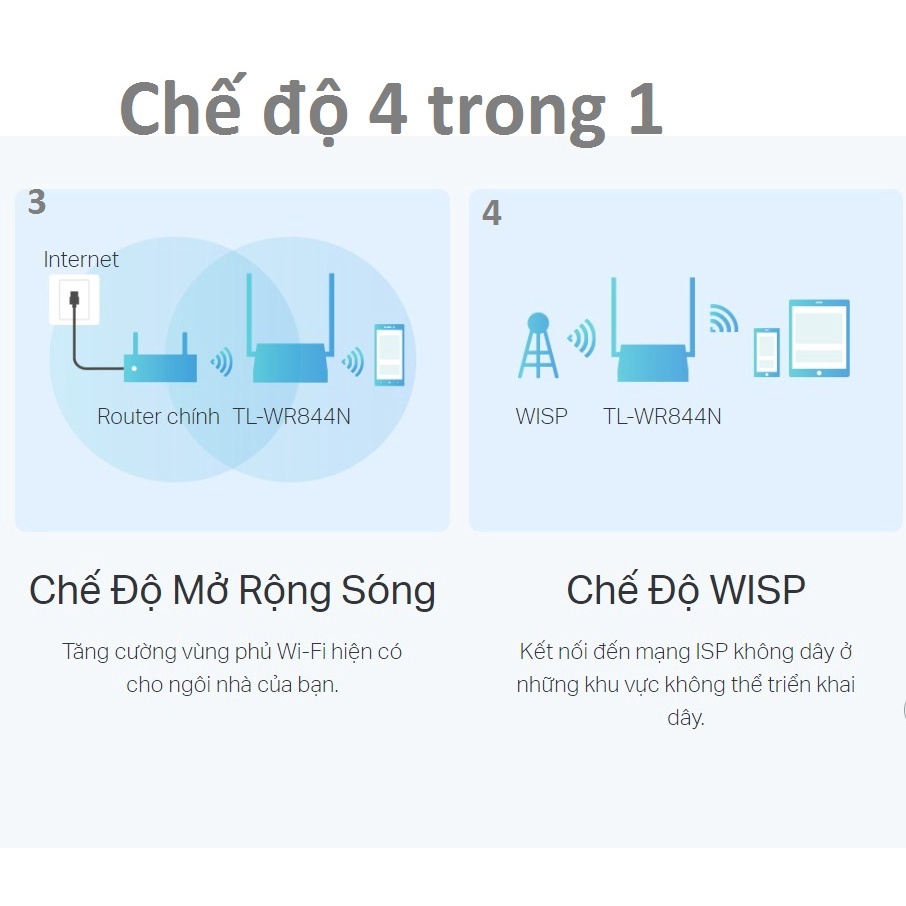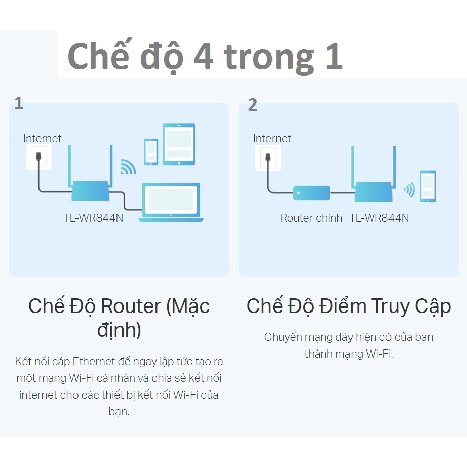 Router wi-fi nhiều chế độ, thương hiệu tplink, model: TL-WR844N- Băng tần 2.4GHz, Tốc độ Wi-Fi 300Mbps