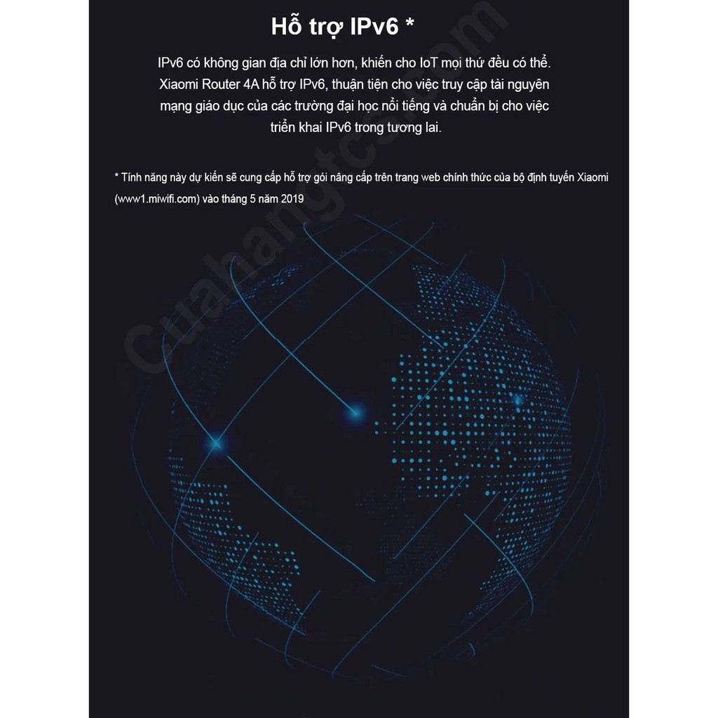 Router Wifi Xiaomi gen 4A bản quốc tế tiếng anh khả năng hộ trợ chuẩn mới IPv6*, mức giá hấp dẫn, khả năng kết nối quản lý từ điện thoại, bắt sóng khỏe và ổn định, phù hợp với nhiều gia đình cần 1 bộ phát ổn định...Giới thiệu Router Wifi Xiaomi gen 4A Quốc Tế:
