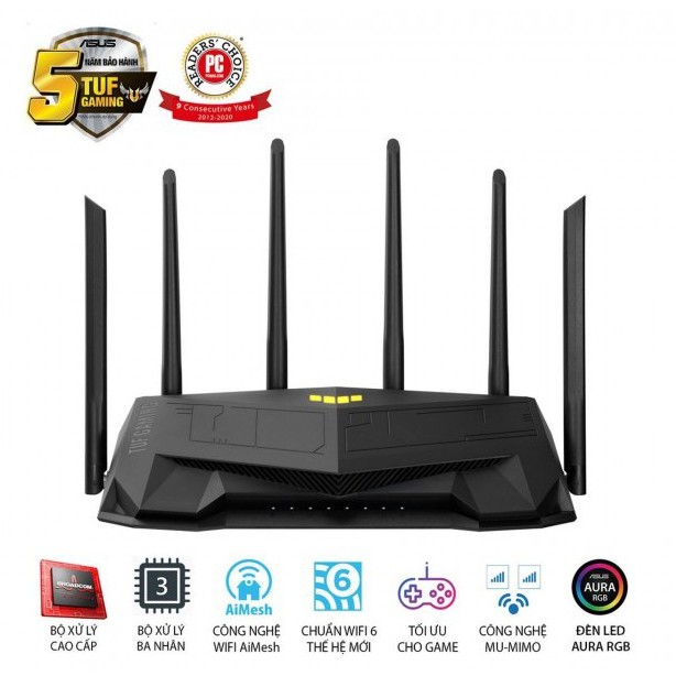 TÍNH NĂNG NỔI BẬT-Router chơi game TUF Gaming AX5400 Wi-Fi 6 hai băng tầ với cổng chơi game chuyên dụng, chuyển tiếp cổng 3 bước, AiMesh cho WiFi Mesh, Bảo mật mạng AiProtection Pro và đèn AURA RGB
