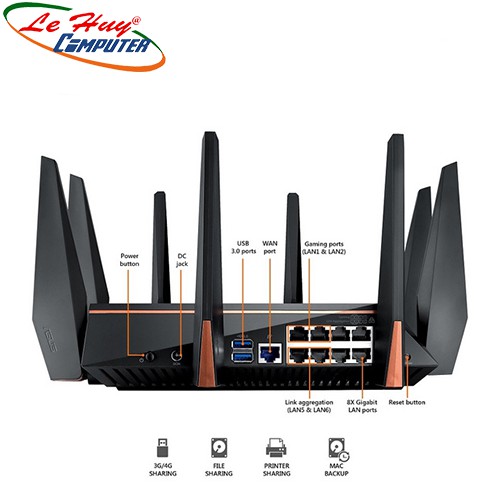 Chức năng tường lửa , VPN server : IPSec Pass-Through, PPTP Pass-Through, L2TP Pass-Through, PPTP Server, OpenVPN Server, L2TP Server . VPN client : PPTP client, L2TP client, OpenVPN client. 3G/4G data sharing , Printer Server. Parental Control, Samba and FTP server, IPTV support. Download Master, Roaming Assist, Link Aggregation- 802.3ad.