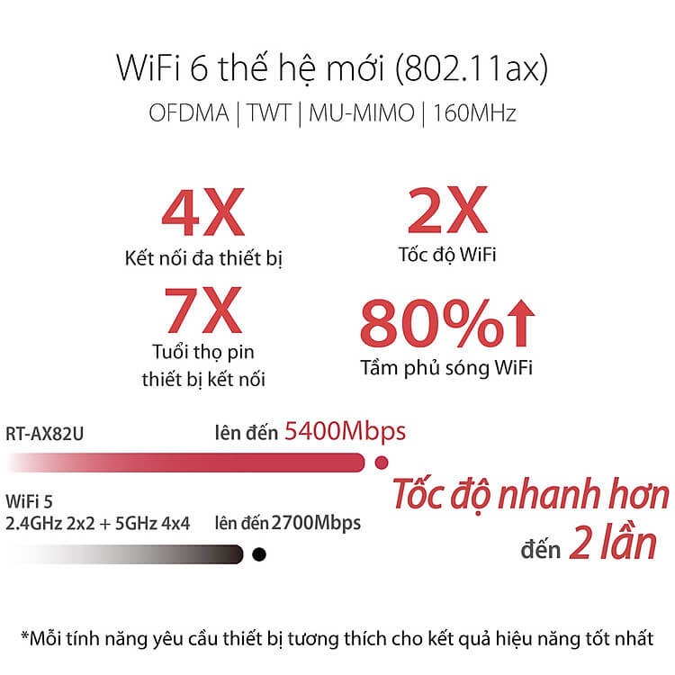 RT-AX82U mang đến cho bạn tất cả những lợi ích của WiFi 6 (802.11ax) và hoàn toàn tương thích với bất kì thiết bị WiFi hiện tại nào của bạn