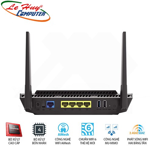 - ASUS RT-AX56U Wifi AX1800 2 băng tần, Wifi 6 (802.11ax), AiMesh 360 WIFI Mesh, AiProtection, USB 3.1.- Hỗ trợ 2 băng tần chuẩn cho tổng tốc độ 1800Mbps (2.4Ghz:600Mbps+ 5GHz: 1200Mbps), 2 ăng-ten rời 5dBi.