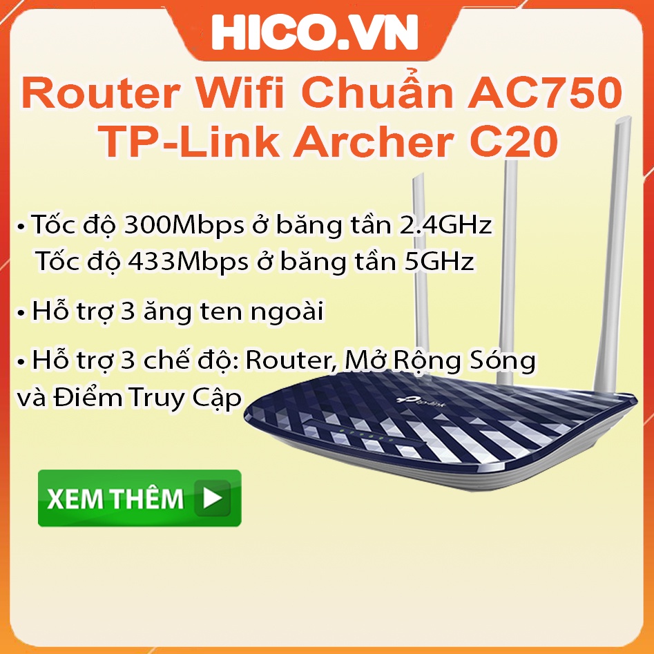 Máy tính & Laptop > Thiết Bị Mạng > Bộ Kích Wifi || Router Wifi Chuẩn AC750 Băng Tần Kép TP-Link Archer C20 Đen - Hàng Chính Hãng - Bảo Hành 12 ThángCòn hàng