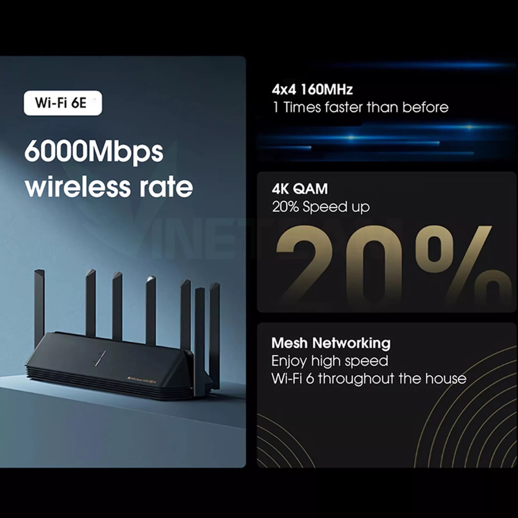 ✔ Không những vậy, Mi Router AX6000 còn là mẫu router đầu tiên trên thế giới hỗ trợ công nghệ truyền dẫn tốc độ cao 4K QAM mới nhất hiện nay, giúp tăng 20% tốc độ truyền tải so với thế hệ trước – 1024 QAM