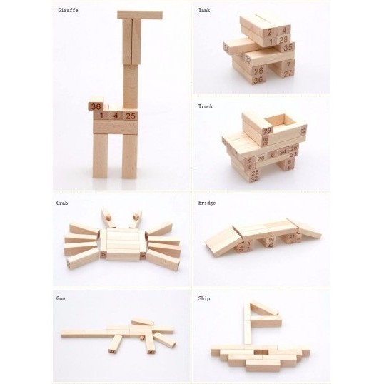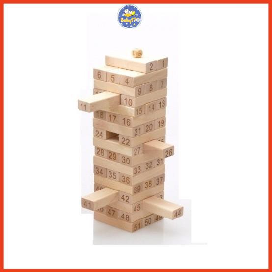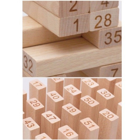 - Chất liệu gỗ thông-Cách chơi : Có thể chơi hai người hoặc nhiều người, dùng xúc xắc để chọn lượt chơi. Người chơi lần lượt đổ xúc xắc và quy định cách rút, sau đó sẽ rút thanh gỗ rồi xếp chồng lên trên. Các cách rút phổ biến là rút số chẵn – lẻ tùy theo nước của xúc xắc là chẵn hay lẻ. Rút từ 1 – 24 nếu xúc xắc ra điểm từ 1 – 3 ; Rút từ 25 đến 48 nếu xúc xắc ra điểm từ 4 – 6. Người nào làm sập tháp gỗ sẽ là người thua cuộc và chịu hình phạt do các thành viên khác quy định.