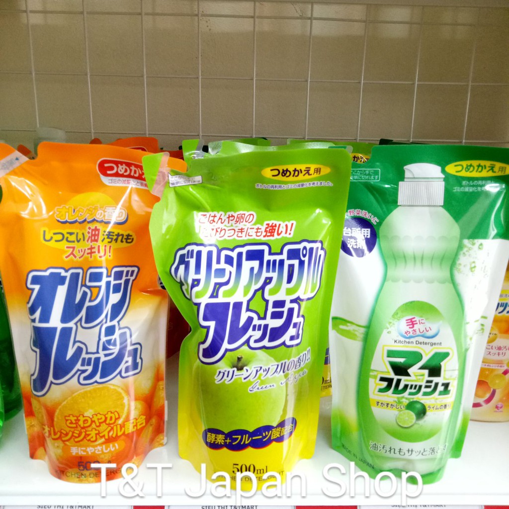 ► Nước rửa bát, rửa hoa quả Rocket My Fresh 500ml Nhật dạng túi với nhiều loại hương chanh,cam,táo dịu nhẹ, chất tẩy dịu nhẹ, được chiết xuất chủ yếu từ chất hữu cơ nên rất an toàn cho người sử dụng. Đặc biệt không chứa chất tẩy rửa có hại cho da tay bạn, dùng được cho những người bị bệnh mãn tính về da tay mà không cần sử dụng găng tayCông dụng: