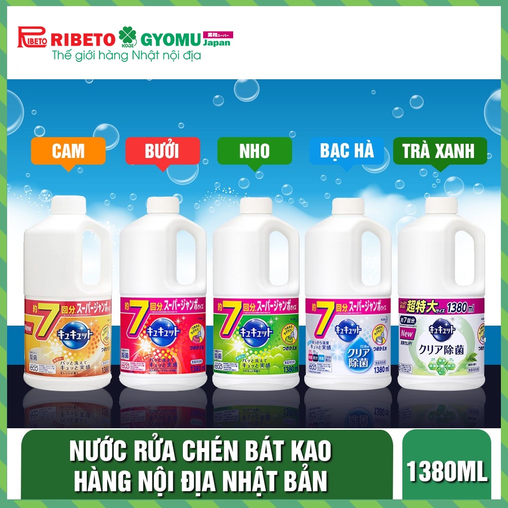 Nước rửa bát Kao diệt khuẩn, an toàn - Hương cam,nho,bạc hà,bưởi,trà xanh chai 1380ml và 770ml - Hàng nội địa Nhật Bản