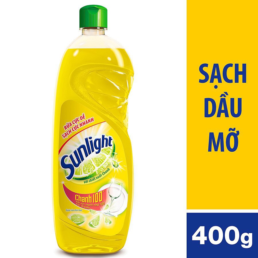 - Mã hiệu: Nước rửa chén bát Sunlight 400ml.- Công dụng: Giúp cho chén bát sạch bong kin kít và ngát hương thơm. Sản phẩm mang lại sức mạnh đánh bay dầu mỡ tương đương 100 trái chanh. Sản phẩm có khả năng rửa sạch dầu mỡ cả trên đồ nhựa và dịu nhẹ dịu với da tay, an toàn cho người dùng. Với hương chanh tươi mát, đây sẽ là sự lựa chọn hoàn hảo cho các bà nội trợ.