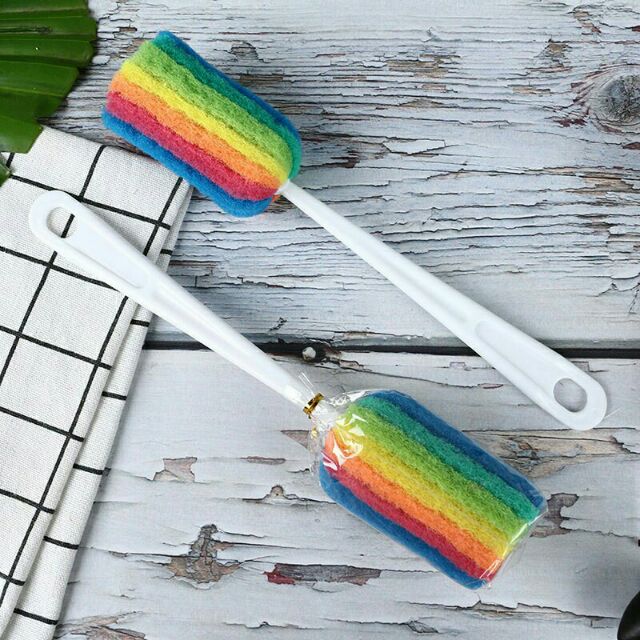 Cây cọ rửa ly cốc cầu vồng ( mấy mẹ bỉm sữa cần lắm ạ, cọ bình sữa cho con quá yên tâm)Cây rửa cốc thiết kế với chiều dài vừa phải, tay cầm thoải mái, đầu cọ gắn mút sợi bông êm ái, nhẹ nhàng tẩy sạch vết dơ, ố vàng bám trên ly tách mà không làm trầy xước ly.