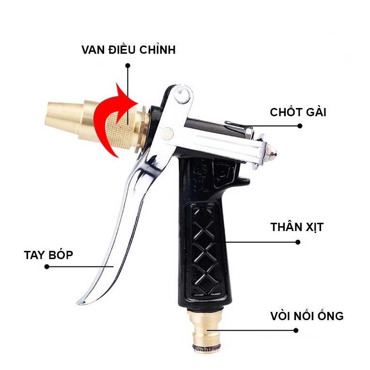 + 1 súng xịt kèm béc phun thẳng bằng đồng, có thể chỉnh mức nước ra bằng cách vặn đầu mèo.