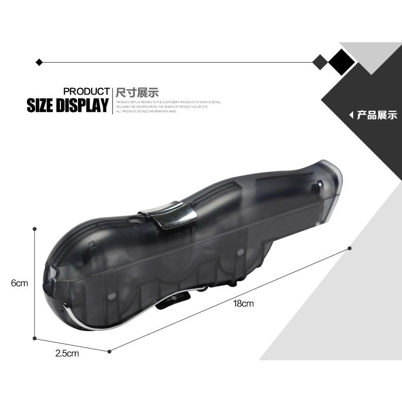 Chất liệu: Nhựa ABSThiết kế chuyên dùng cho việc vệ sinh xích xe đạp. Kẹp bộ rửa vào xích, cho một chút hóa chất tẩy rửa dầu mỡ vào, quay xích, các chổi lông bên trong hộp cùng với hóa chất rẽ vệ sinh xích của bạn sạch sẽ khỏi dầu mỡ, bụi bẩn. Vệ sinh xong bạn lau sạch xích bằng vải mềm, sau đó tra dầu chuyên dùng cho xích xe đạp vào từng trục xích, để vài phút và quay xích cho dầu ngấm vào bên trong trục, sau đó lau sạch dầu còn dính trên xích.
