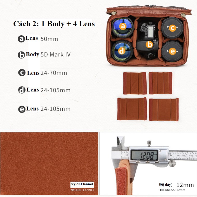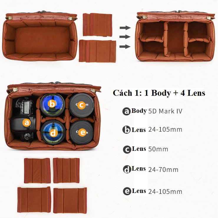 Thiết kế túi đựng được 1 body kèm 2 lens, phù hợp với từng mục đích sử dụng khác nhau.