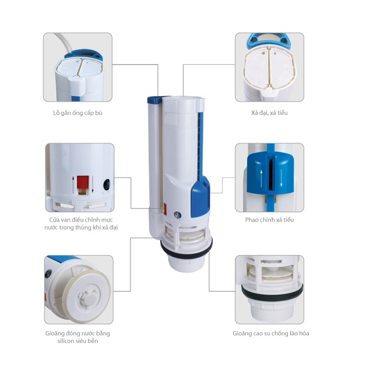 Bộ ruột đầy đủ dành cho các loại bồn cầu hai nút nhấn, hai khốiChiều cao cọc thoát nước (có nút nhấn): 26cm